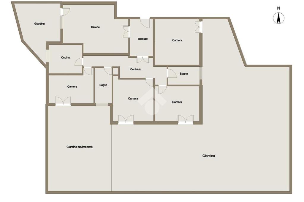 L'immobile si sviluppa su di un'ampia superficie ben distribuita e si compone di: spazioso ingresso, salone doppio, quattro camere matrimoniali, cucina abitabile, due bagni, entrambi con finestra, ed un maestoso giardino che circonda l'intera proprietà, in parte pavimentato.